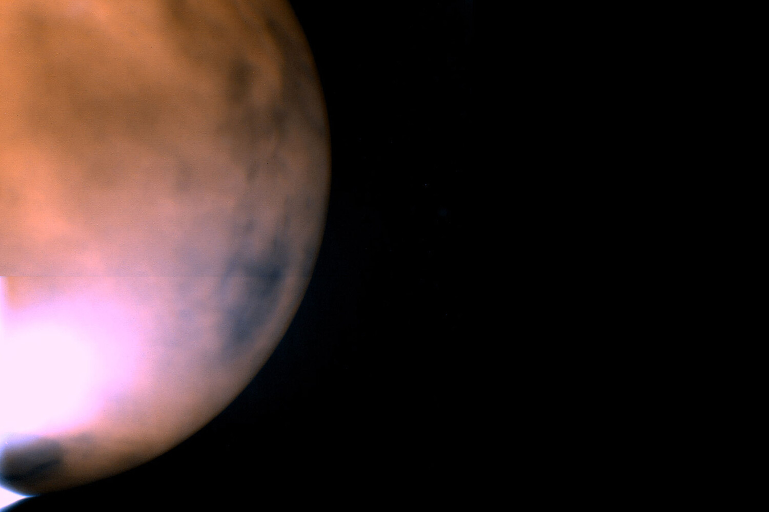 Инфракрасный снимок Венеры аппаратом «Акацуки». Съемка велась на длине волны в 1000 нм, благодаря чему сквозь облака просвечивает рельеф