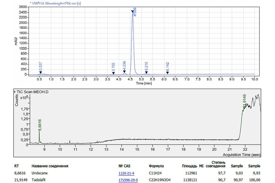 В ходе лабораторного анализа методом газовой хроматографии с масс-спектрометрическим детектированием (GC-MSD) на оборудовании Agilent 1260 Infinity II MSD 6160A подтвердил наличие Тадалафила (CAS 171596-29-5, формула C22H19N3O4) с временем удерживания 21,9149 минут и высокой степенью совпадения (90,7%) с библиотечным спектром NIST17.L.