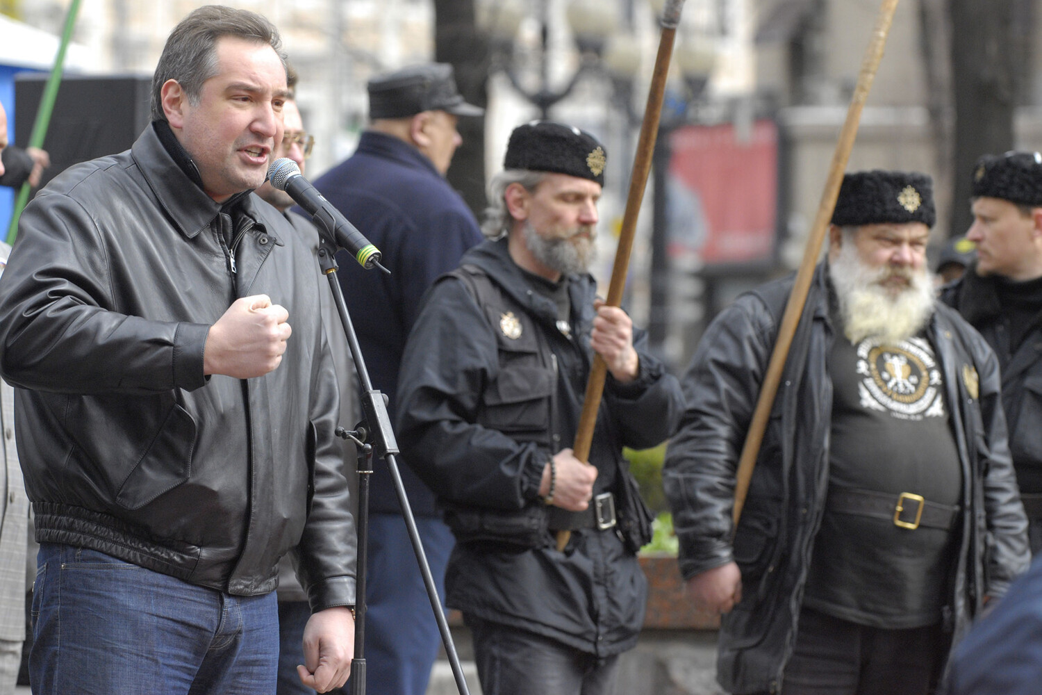 Депутат Госдумы РФ Дмитрий Рогозин (слева) выступает на митинге оргкомитета «Русского Марша» при участии ДПНИ (организация запрещена в России) в поддержку инициативы переименования улицы А. Кадырова в улицу «Псковских Десантников», Москва, 2007 год