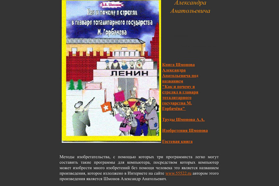 По одной из версий, Шмонов задумал убить Горбачева еще в 1987 году. Он набивал на пишущей машинке, тайно расклеивал в электричках и подкладывал в почтовые ящики листовки, в которых призывал расправляться с руководителями СССР. Чтобы избавиться от потенциального вещдока, заговорщик стер литеры напильником, закопал машинку в секретном месте и купил себе новую.