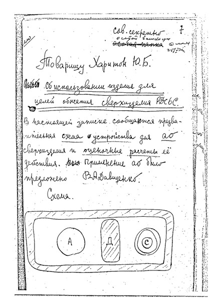 Начерченная Сахаровым от руки принципиальная схема термоядерной бомбы. Справа расположена «слойка»