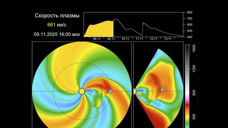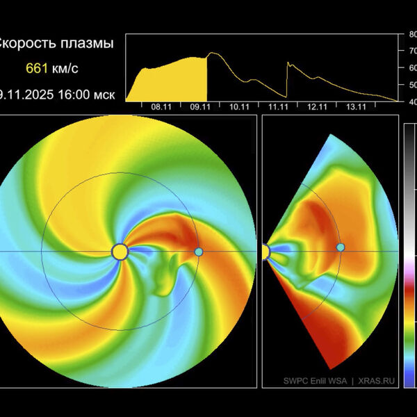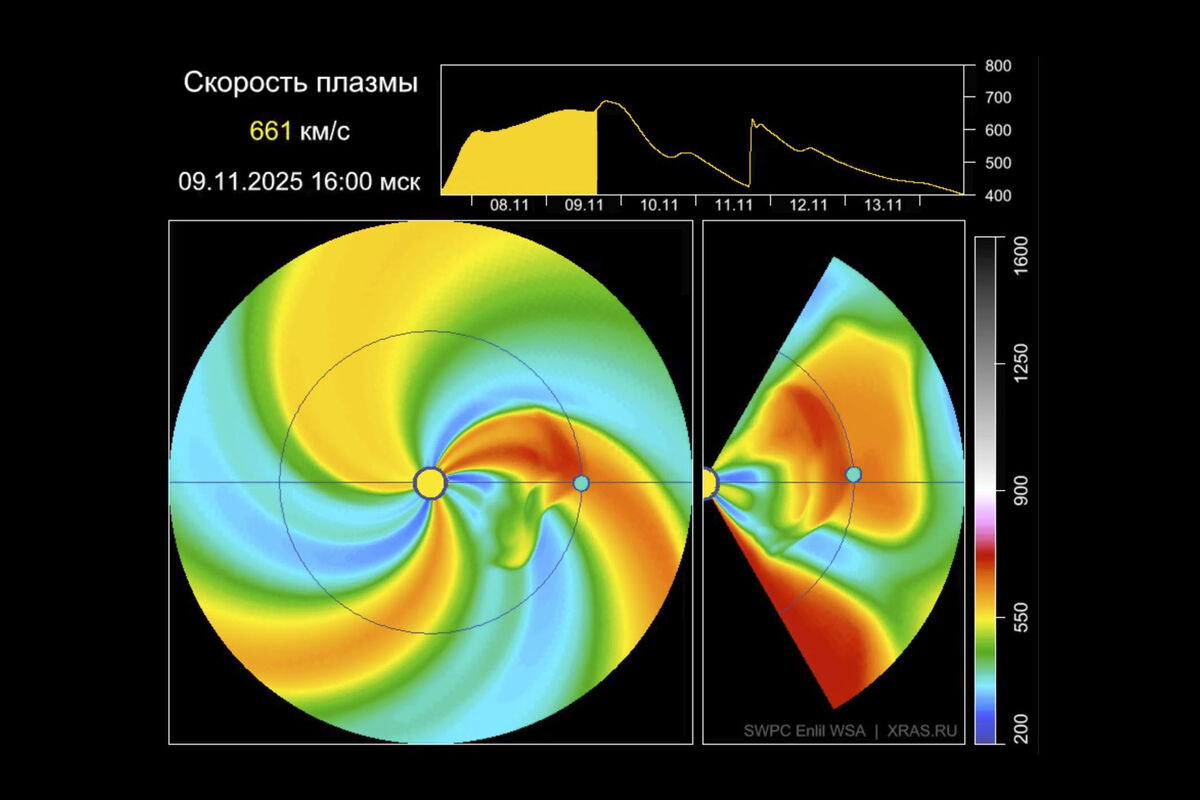 Там рассказали, что от первого выброса в первой половине дня 10 ноября ожидается средняя магнитная буря (уровня G2). Прилет от второго выброса прогнозируется поздно вечером 11 ноября. Его наиболее плотные части в момент отрыва от Солнца ушли севернее и должны пройти выше Земли.