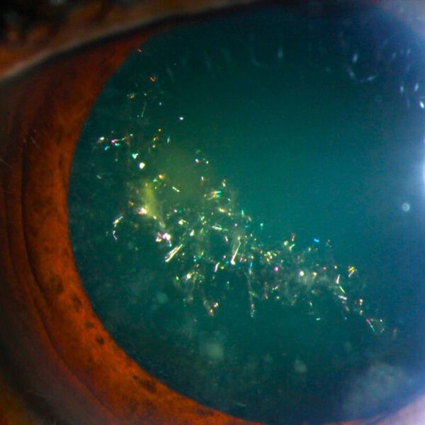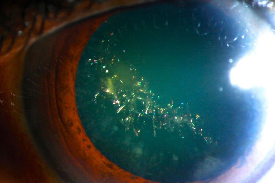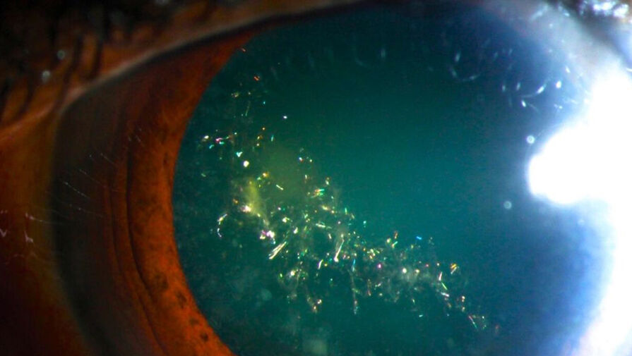 Несмотря на эффектный внешний вид, речь идет о возрастном изменении. Такая катаракта возникает из-за накопления кальция в хрусталике, что ускоряет распад кристаллинов — белков, обеспечивающих его прозрачность. В результате образуется избыток аминокислоты цистина, которая кристаллизуется в виде тонких иглообразных структур. Именно они преломляют свет и создают «праздничное» сияние.
