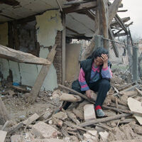 Жительница города Чуприя Ружица Маринкович на развалинах своего дома, разрушенного в результате ночных бомбардировок самолетами НАТО, 11 апреля 1999 года