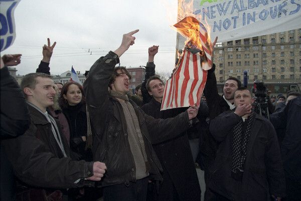 Против «фашизма Америки» в последние дни марта 1999 года в Москве митинговали футбольные фанаты и студенты. Несколько тысяч человек пытались штурмовать здание дипмиссии на Новинском бульваре, закидывая его яйцами, пузырьками с чернилами и зеленкой. «Fucking americans! Get out to your fucking country!» — так нецензурно звучал один из лозунгов манифестантов. Но российский ОМОН стойко оборонял посольство США.