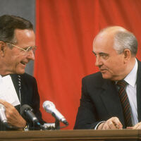 Президент США Джордж Буш-старший и президент СССР Михаил Горбачев на пресс-конференции в Москве, 1991 год