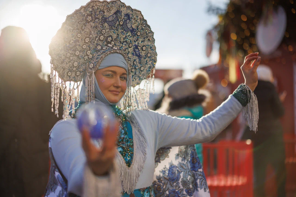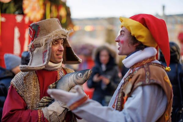 Между торговыми рядами, деревянными колодцами и мельницами прогуливаются персонажи из русского фольклора. Красна девица-весна в длинном сарафане, зеленом кокошнике и с корзиной подснежников в руках прошла вслед за парнем в алой рубахе и сапогах, девушки в пестрых вышитых платках и с нарумяненными щеками приглашают пуститься в пляс всех гостей, тут же чинно ступают зажиточные «крестьяне», решившие отдохнуть на празднике от повседневных забот.