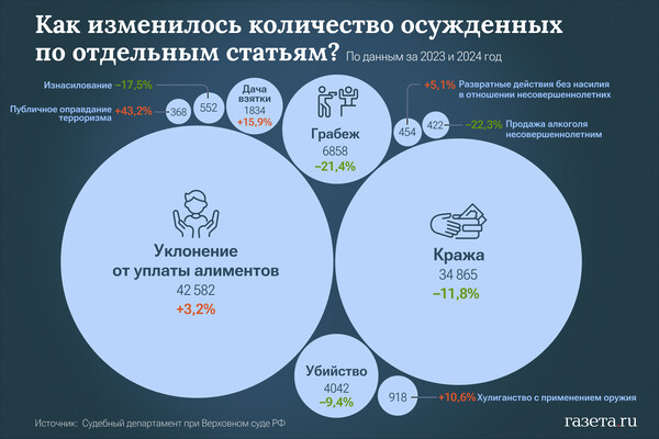 Общее количество осужденных, согласно официальным данным, снизилось более чем на 42 тысячи человек. Правда, меньше в России стали выносить и оправдательных приговоров. Если в 2023-м по всей стране были оправданы 1 036 подсудимых, то в прошлом году — 990.