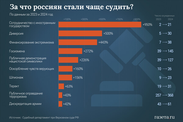 Количество россиян, осужденных за диверсию, выросло в шесть раз, за финансирование экстремистской деятельности — в 5,5 раза, за госизмену — почти в четыре раза, а за шпионаж — в 2,5.
