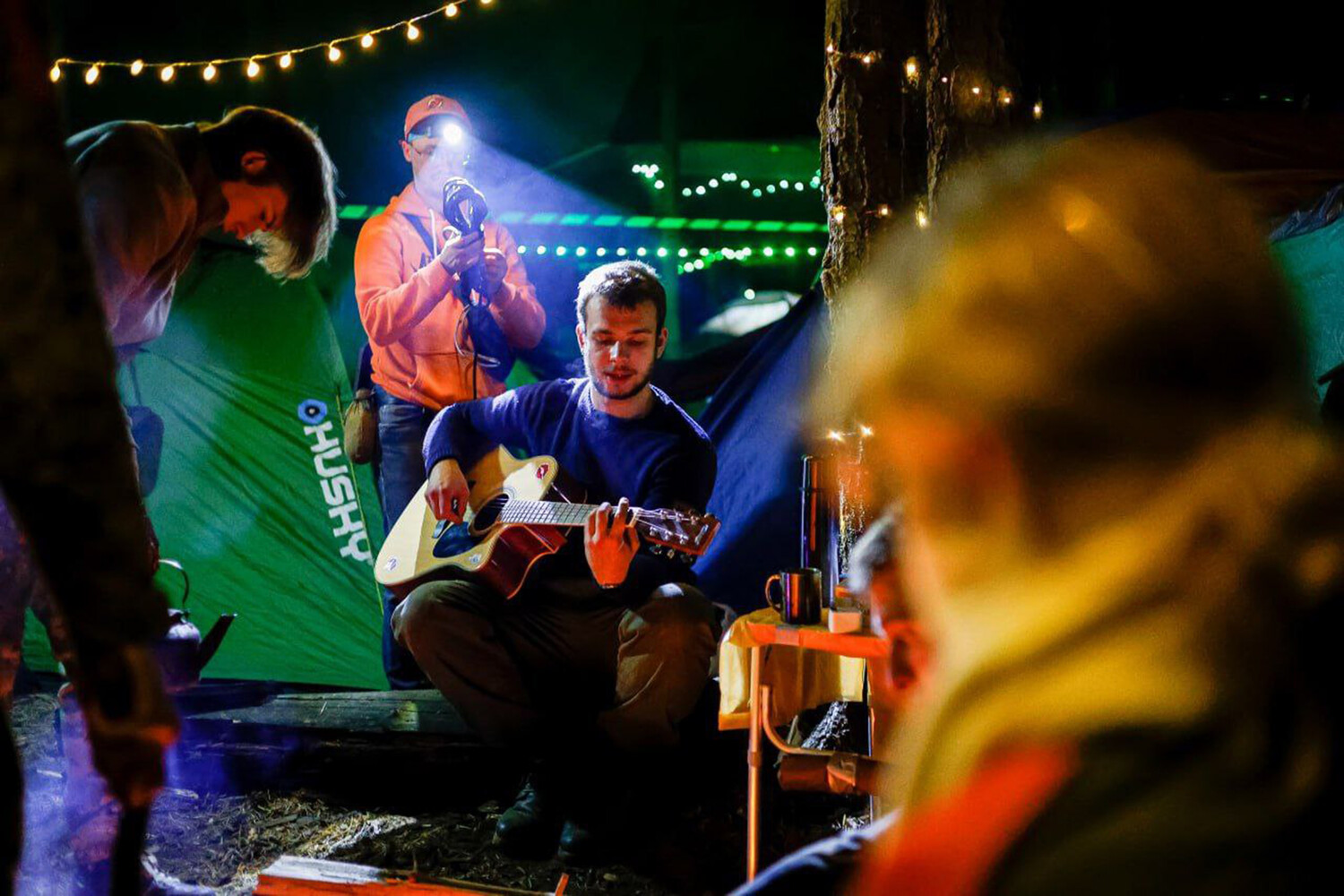 Участники военно-ролевой игры «Лес» поют песни под гитару у костра