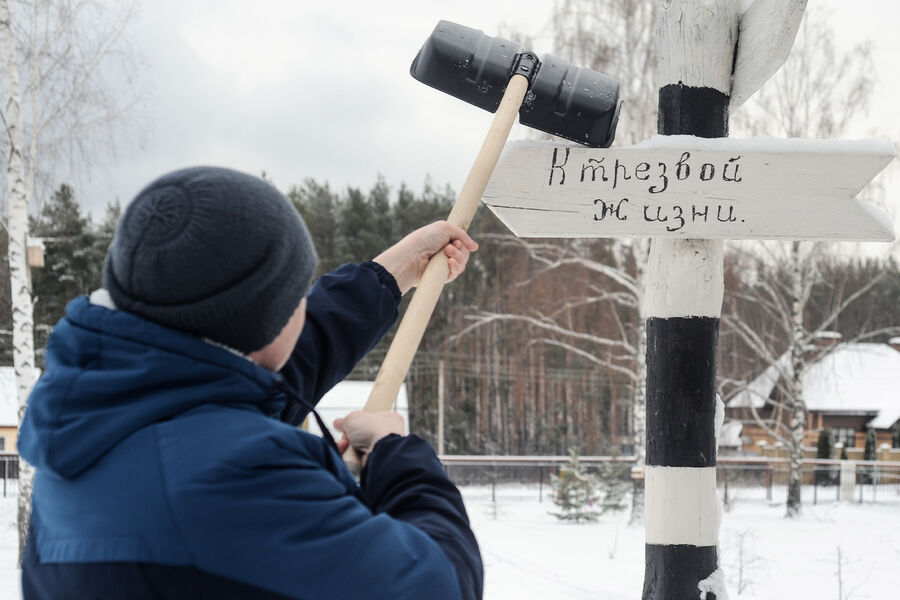 Пациент психиатрической клинической больницы убирает снег во время трудотерапии