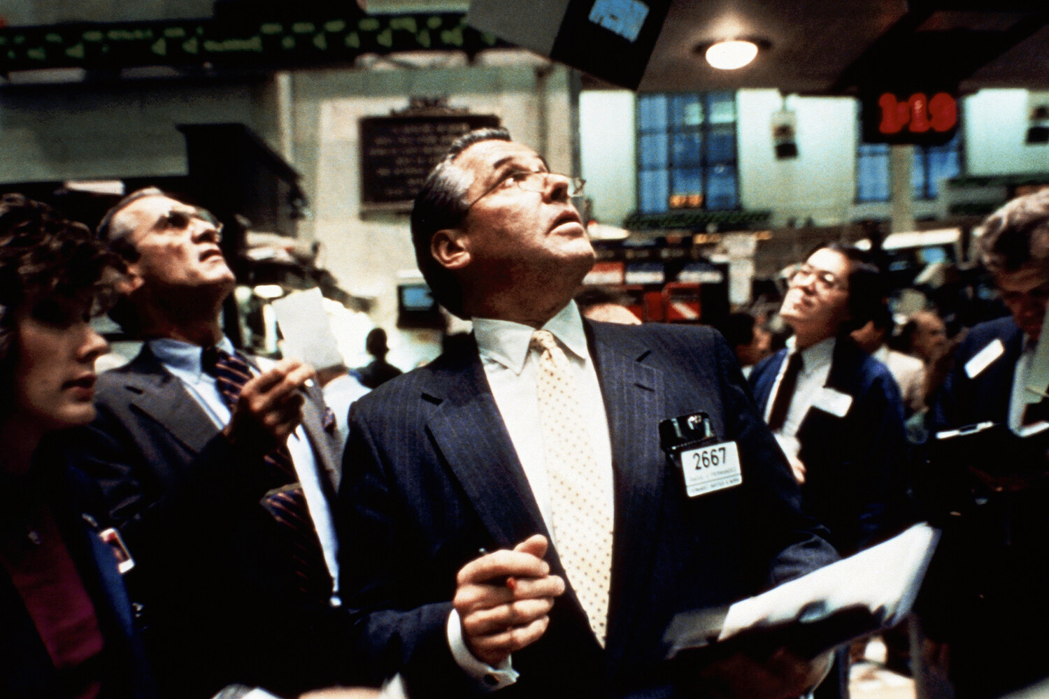 Трейдеры Нью-Йоркской фондовой биржи наблюдают за сделками во время обвала рынка 19 октября 1987 года