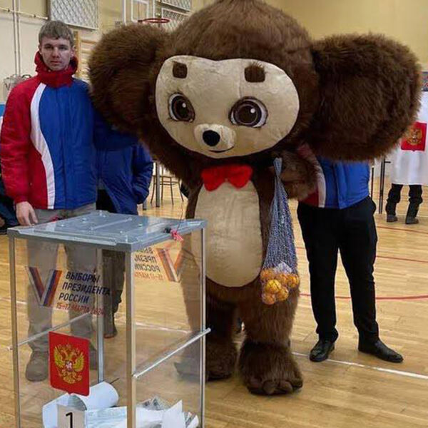 В Югорске (ХМАО) мужчина пришел на избирательный участок в костюме Чебурашки. Мужчина проголосовал на выборах и угостил жителей апельсинами. В Подмосковье еще один Чебурашка встречает избирателей в футболе с триколором и апельсинами.