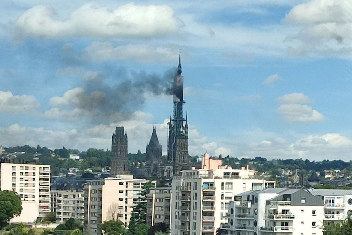 От шпиля собора поднимаются густые клубы дыма.