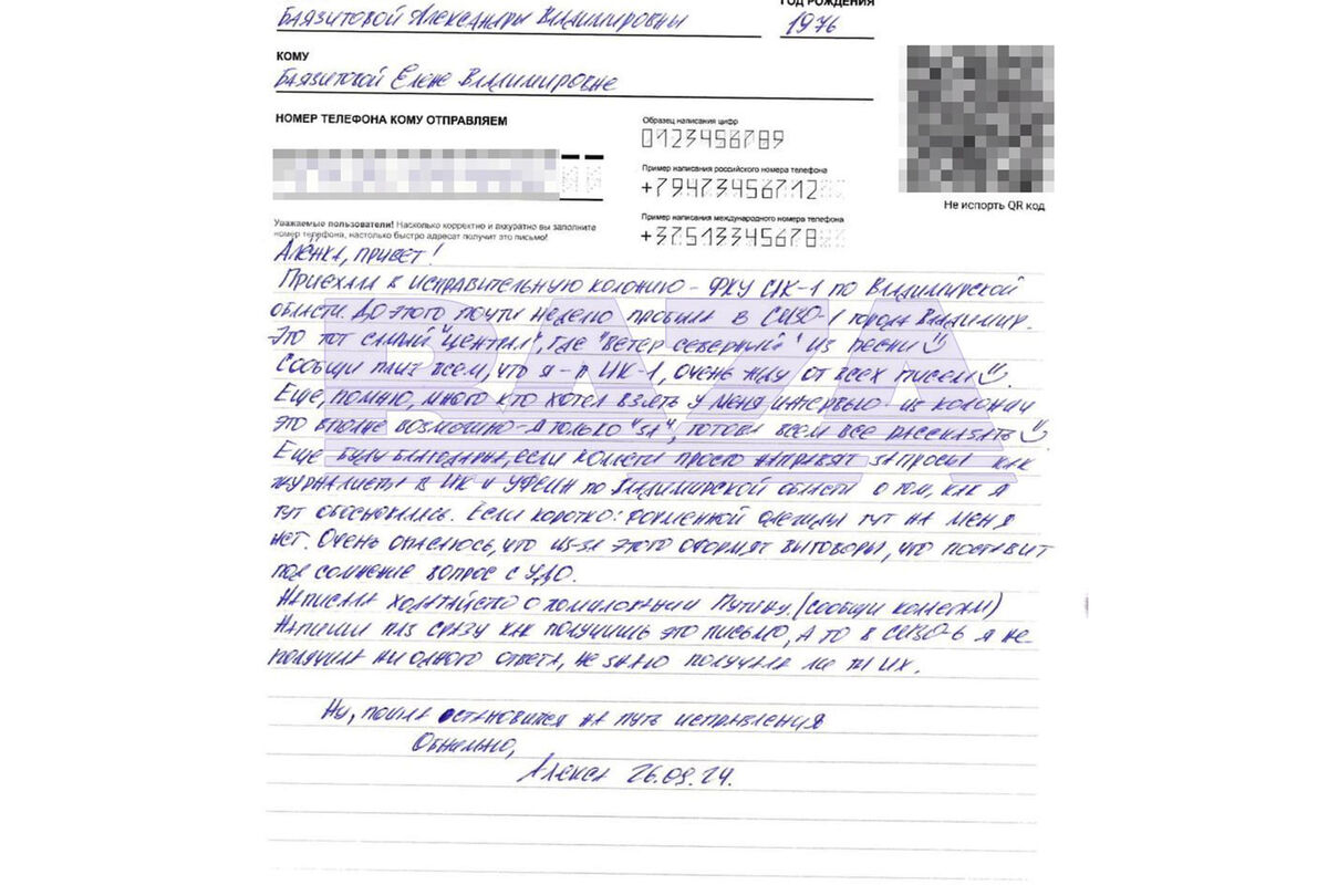 Она написала письмо из ИК-1 во Владимирской области, куда ее этапировали после недели в СИЗО-1 во Владимире. Баязитова сообщила, что написала прошение о помиловании на имя президента.