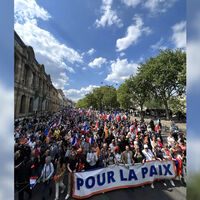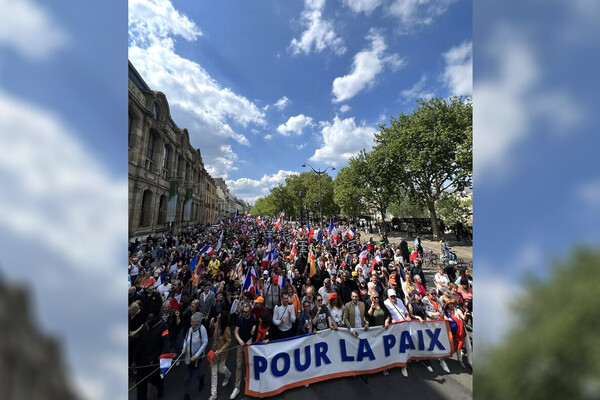 Протестная акция, организованная партией «Патриоты», началась в центре французской столицы на площади Пале-Рояль. В ней принимают участие несколько сотен граждан. В руках они держат национальные флаги Франции и плакаты с различными лозунгами. На некоторых плакатах написано: «Французы за мир», «Остановите НАТО!». Также манифестанты держат растяжки: «За мир!». Они выступают против политики французского президента Эммануэля Макрона.