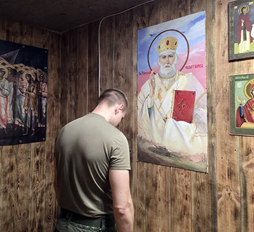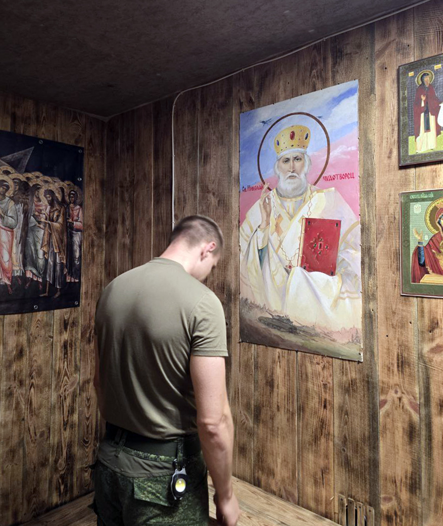 На фотографии запечатлен мужчина, молящийся перед этой иконой в форме российского военнослужащего. Икона представляет собой современную интерпретацию классического изображения Николая Чудотворца — святой держит Евангелие в одной руке, а пальцами другой руки совершает жест благословения. Фон иконы разделен на несколько частей: в небе пролетают самолеты, ниже — движутся танки на земле, а из облаков в белых, синих и красных оттенках складывается российский триколор.