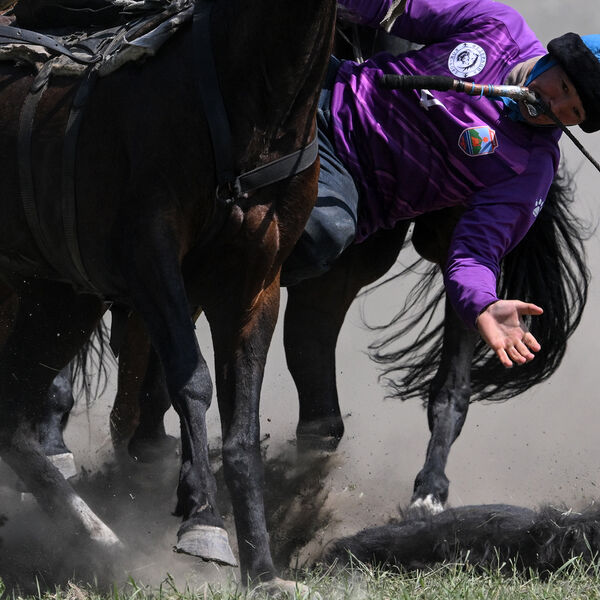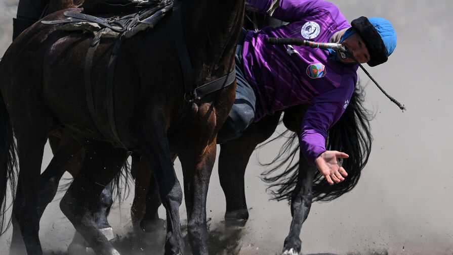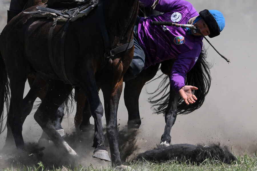 На кадрах с места заметно, как большое количество людей на лошадях сходятся к небольшому бредут по полю. Отмечается, что они действительно играли тушей козла.