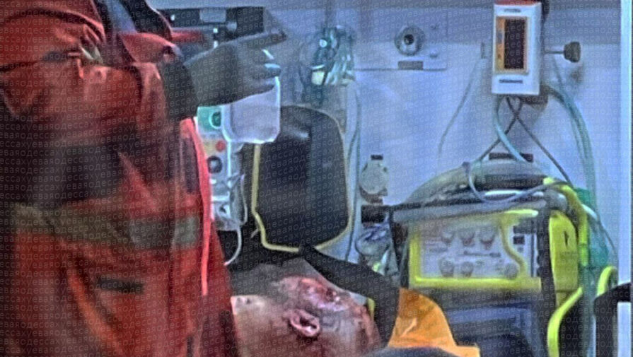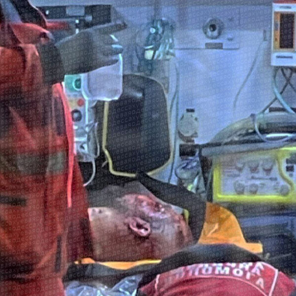 На кадрах с места происшествия у здания работают сотрудники экстренных служб. Медики отвозят окровавленного мужчину на каталке к машине скорой помощи.