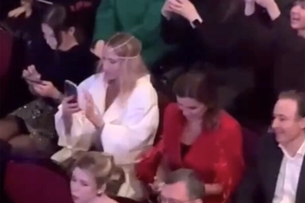 На кадрах видно, что Кулеба и Павелецкая сидят на креслах концертного зала возле прохода. Экс-министр одет в черный костюм, белую рубашку и галстук-бабочку, а его гражданская супруга — черное вечернее платье с глубоким декольте.