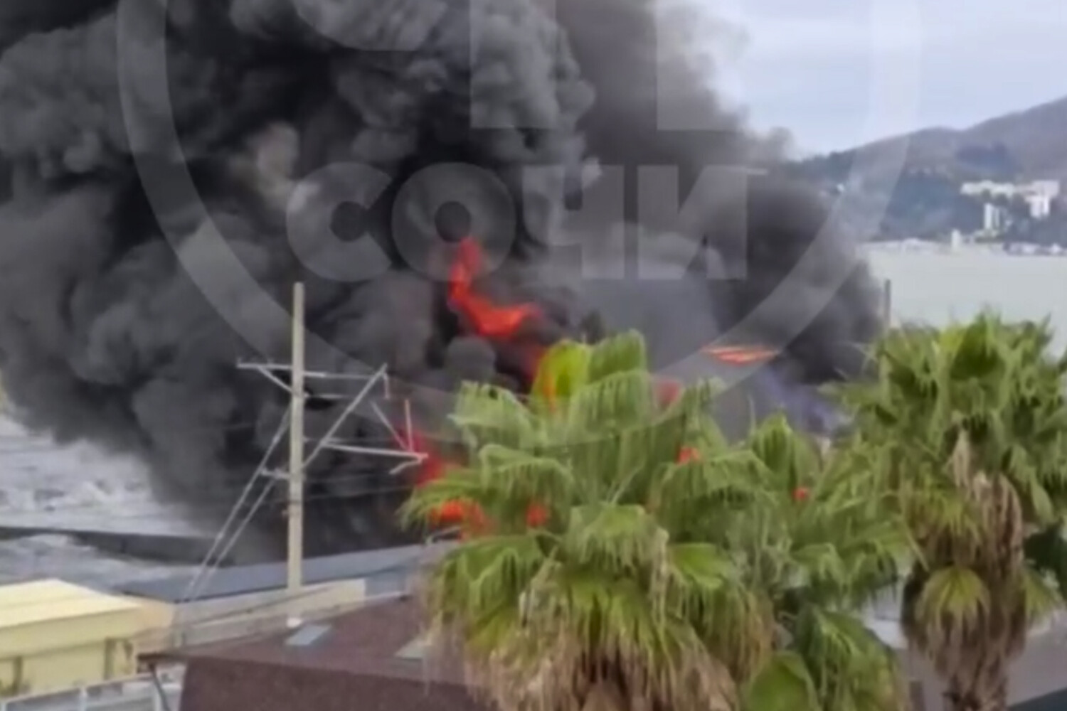 В публикации уточняется, что огонь охватил кафе и складские помещения. Информация о возгорании поступила в экстренные службы в 10:20 (совпадает с мск), после этого на место происшествия были направлены подразделения Сочинского пожарно-спасательного гарнизона.