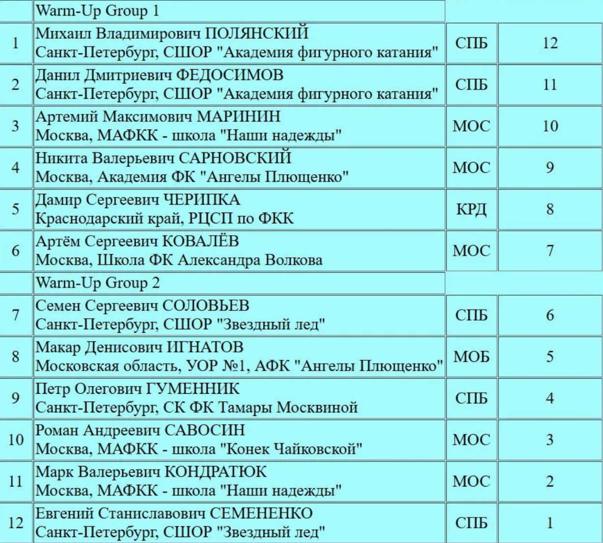 На разминку вышли участники второй группы — Семен Соловьев, Макар Игнатов, Петр Гуменник, Роман Савосин, Марк Кондратюк и Евгений Семененко.