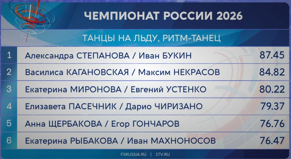 Ну что ж, вот таким получился ритм-танец на старте чемпионата России в Санкт-Петербурге. Александра Степанова и Иван Букин не дали слабины, реализовав свой статус фаворитов, но в целом борьба очень упорная. И уровень — высочайший. Спасибо, что были с нами, и до новых встреч. Трансляцию вел Александр Седов.