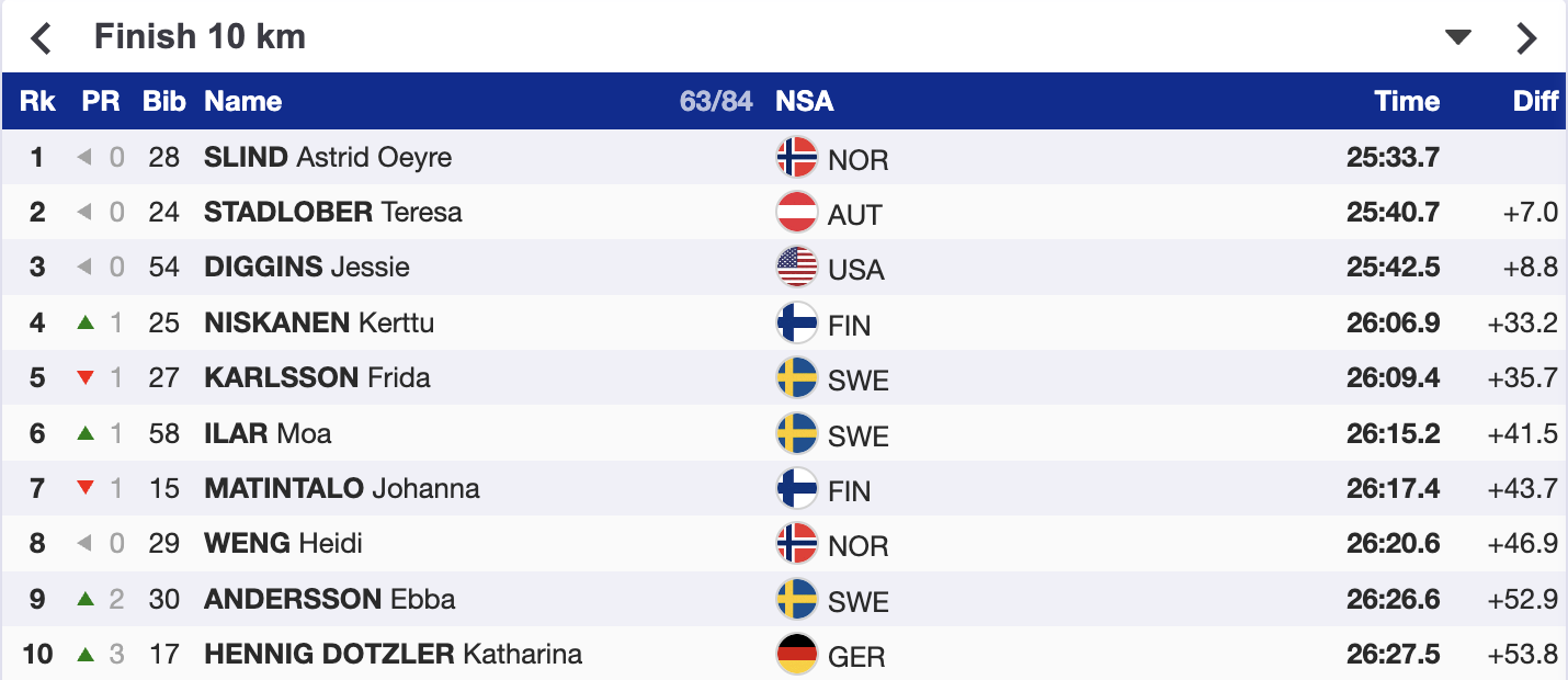 Фрида Карлссон тем временем обновила лучшее время на контрольной отсечке 3 км. Однако Астрид Ойре Шлинн дышит ей в спину, уступая всего 0,8 секунды.