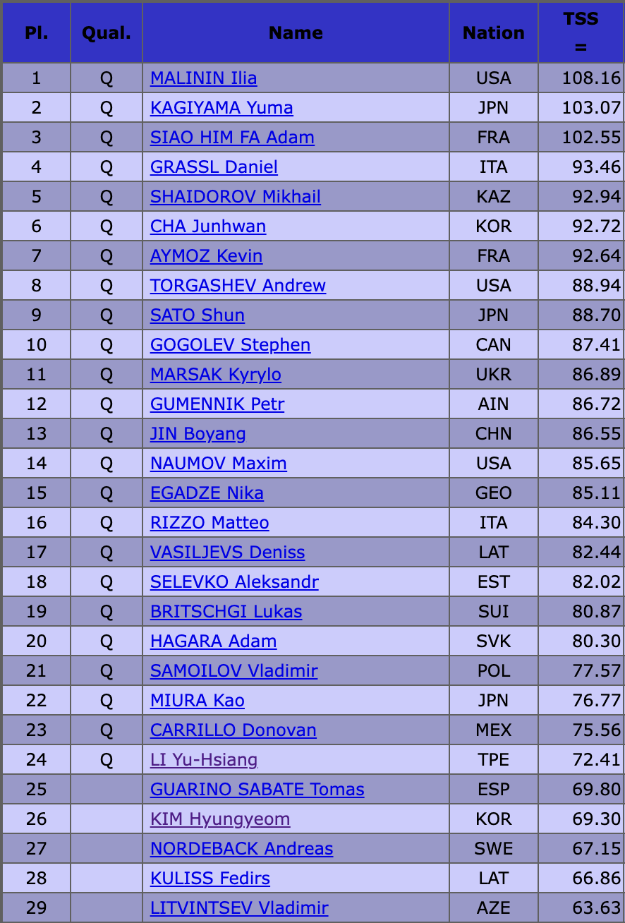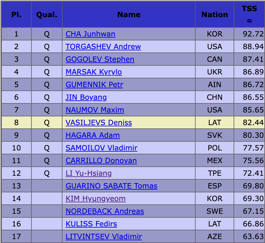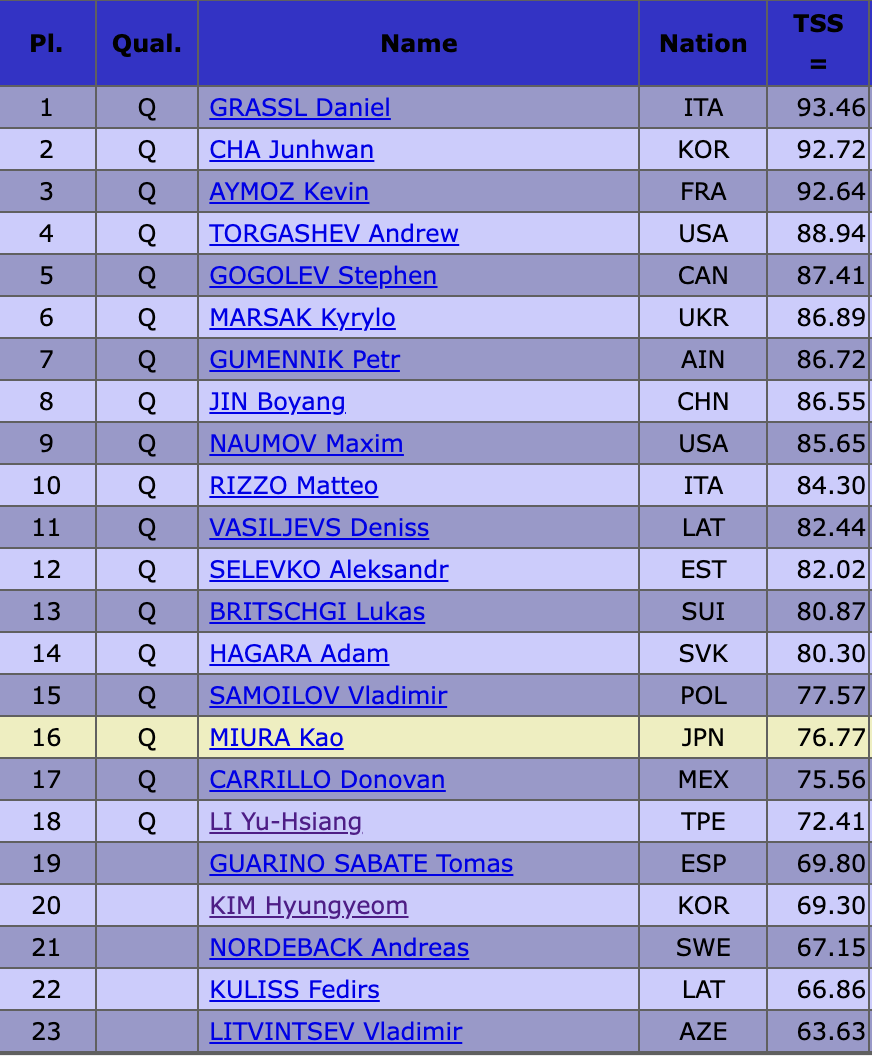 Оценка Ю-Сян Ли — 72,41 балла. Благодаря этим баллам тайваньского фигуриста Петр Гуменник только что официально квалифицировался в произвольную программу.