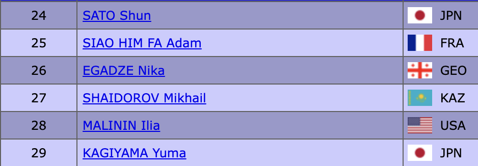 На разминку вышли фигуристы из последней группы, которые обладают самым высоким рейтингом! Совсем скоро мы увидим выступление Ильи Малинина — русско-американского гения четверных прыжков. Порядок выступления (надо кликнуть на картинку):