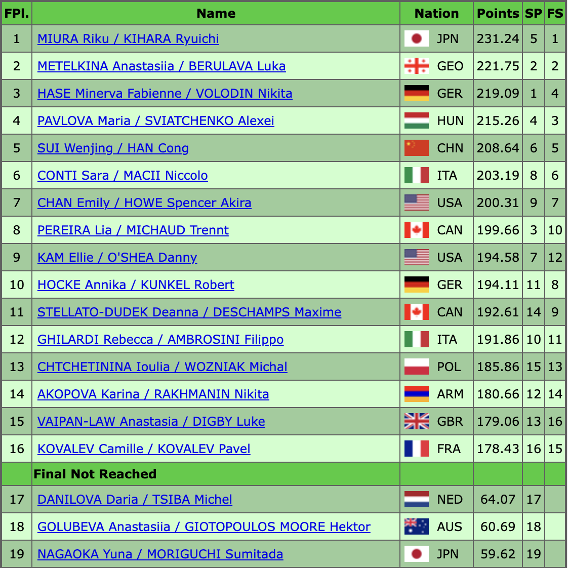 Напомним, что по итогам короткой программы на первом месте оказался бывший российский фигурист Никита Володин, выступающий в паре с Минервой Фабьенне Хазе. На промежуточном втором месте — тоже экс-россияне Анастасия Метелкина и Лука Берулава. Еще одна пара из бывших россиян — Мария Павлова и Алексей Святченко — оказались на четвертой позиции, всего в одном балле от канадцев, которые заняли третье место. Это значит, что сегодня сразу пять экс-российских спортсменов будут бороться за медали. Итоги короткой программы были такими: