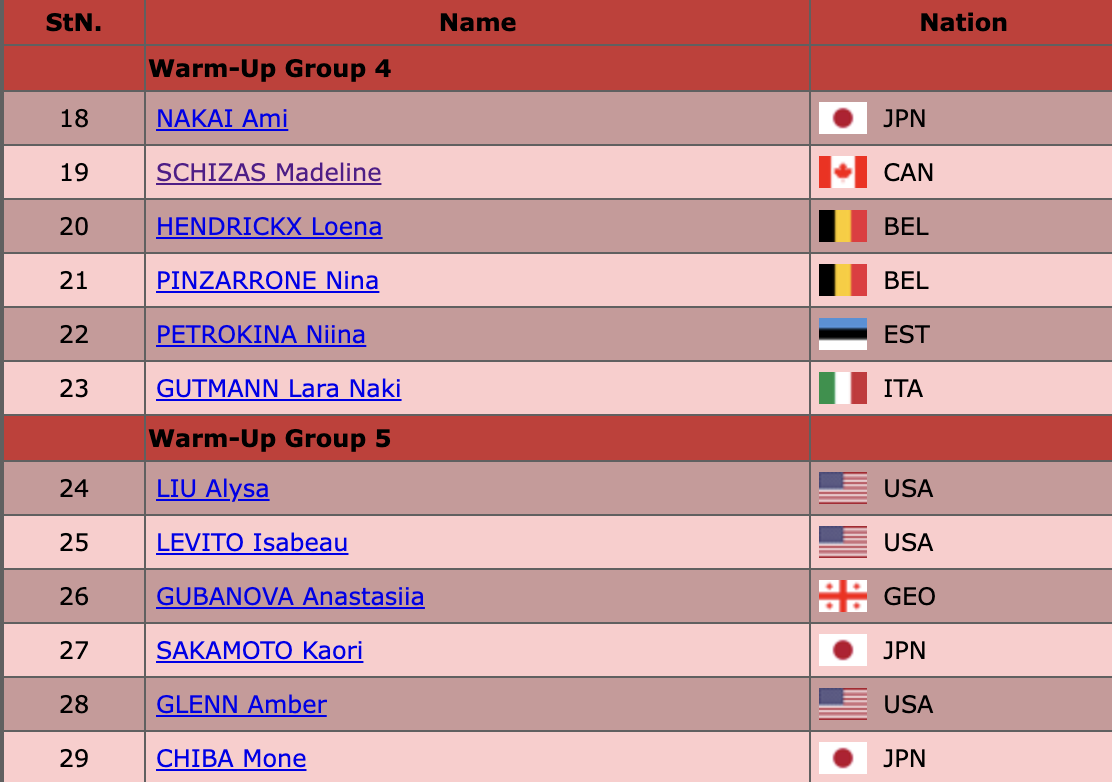 На разминку вышла последняя группа участниц, в которую попали самые высокие по рейтингу фигуристки! Это Алиса Лью, Эмбер Гленн и Изабо Левито из сборной США, бывшая россиянка Анастасия Губанова, которая выступает за Грузию, а также японские фигуристки Каори Сакамото и Моне Чиба.
