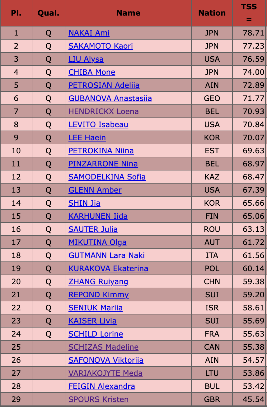 Оценка Алисы Лью — 76,59 балла! Она получила всего на два балла меньше, чем Ами Накаи, которая исполнила тройной аксель! Теперь Аделия Петросян сместилась на промежуточное третье место в турнирной таблице.
