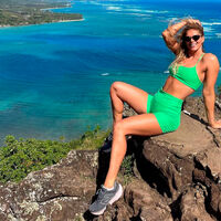 31-летняя спортсменка позирует в коротких зеленых шортах и топе.