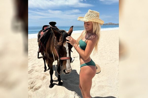 Спортсменка выложила снимок, на котором она позирует для подписчиков, находясь рядом с лошадью на песчаном берегу одного из пляжей. Данн предстала в ярком образе, надев вместе с купальником белую шляпу.