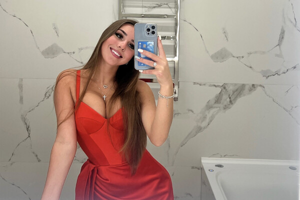 На снимке спортсменка позирует в красном платье с декольте.