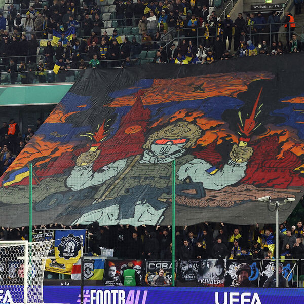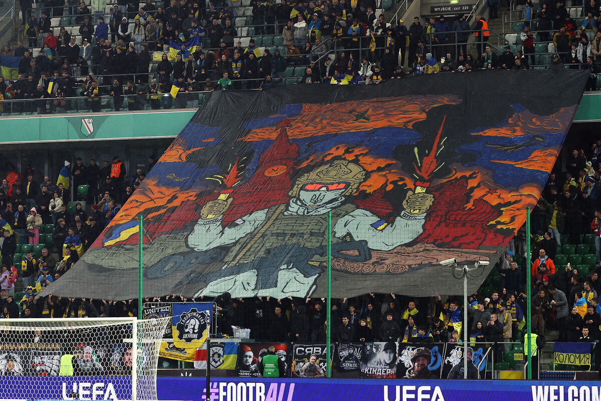 На фоне нарисованного пожара был изображен фанат в экипировке ВСУ с файерами в руках. При этом Союз европейских футбольных ассоциаций (УЕФА) никак на инцидент не отреагировал.