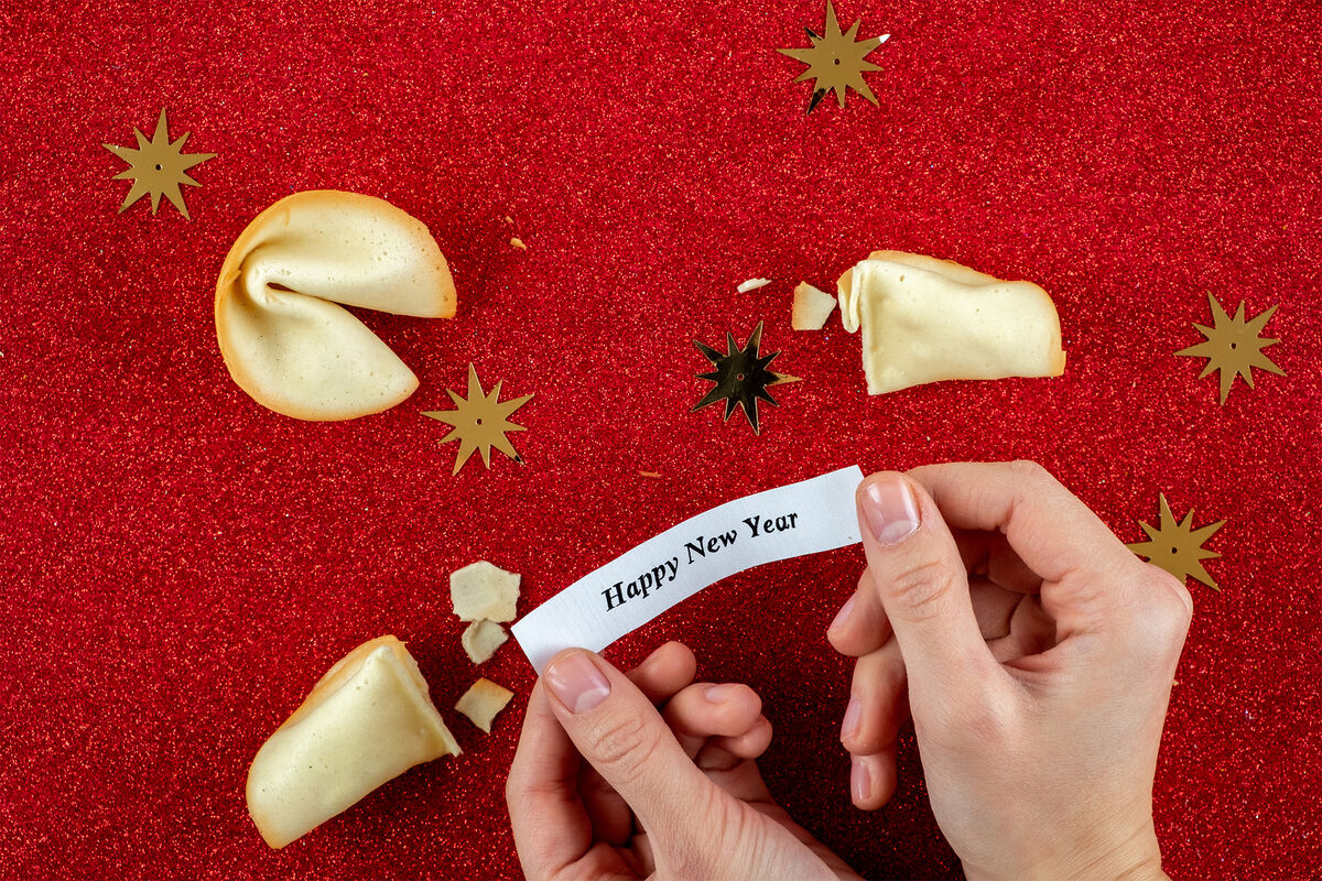 Предсказания на бумажке могут иметь вид китайских печений. Это хрустящие сладости из тонкого теста, в котором спрятаны бумажные полоски с текстом. Печенье можно приготовить самостоятельно или сделать российский вариант — сладкие запеченные орешки. В каждый орешек нужно вложить «пророчество» на грядущий год, соединить половинки и обернуть орешек в разноцветную фольгу, а затем сложить в красивую вазу для печенья.