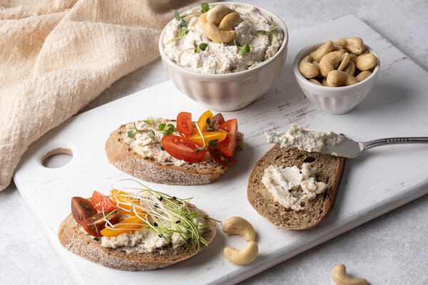 Сливочный соус с кешью. Нужно замочить орехи в воде на 4–6 часов, затем измельчить в блендере с добавлением чеснока, лимонного сока, соли и специй. Получается веганская альтернатива сливочному соусу — подойдет к пасте, запеченным овощам или рыбе.