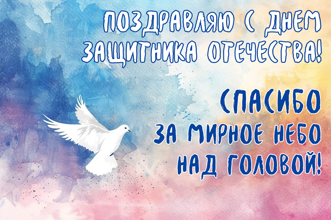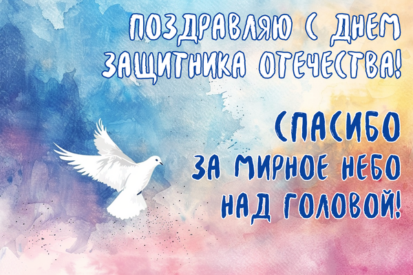 • С Днем защитника Отечества! Желаю тебе мирного неба над головой и спокойных дней!