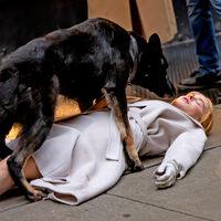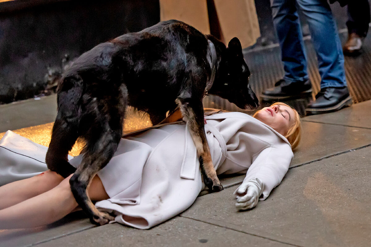 Николь Кидман снималась вместе с собакой. Актриса, следуя сценарию, споткнулась и упала на асфальт. В этот момент к ней подбежал пес. Она погладила домашнего питомца и легла на тротуар. Знаменитость была одета в серое пальто, платье, телесные колготки и белые кеды. Визажисты сделали ей макияж с черными стрелками, а стилисты — собрали волосы в хвост.
