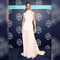 В галерее Tokio Node в Токио прошло открытие выставки Tiffany & Co. Tiffany Wonder. Для выхода на публику Рози Хантингтон-Уайтли предпочла белое облегающее платье с полупрозрачной юбкой. Образ также дополнили босоножки и брошь. Волосы ей уложили в аккуратный хвост и сделали макияж с красно-кирпичной помадой.