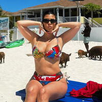 Перед камерой 45-летняя Кортни Кардашьян предстала в ярком купальнике с разноцветным принтом, который состоял из лифа на тонких бретелях и трусов с завышенной талией. Звезда реалити-шоу также надела черные солнцезащитные очки. Она собрала волосы в пучок и сделала нюдовый макияж. Бизнесвумен сидела на шезлонге на пляже.