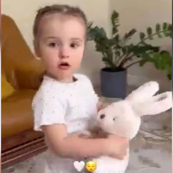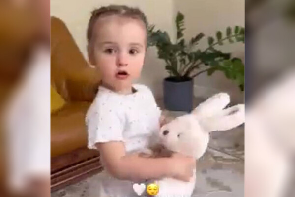 Юлия Королева поделилась фотографиями, на которых дочь демонстрирует подарок папы — плюшевого зайца.