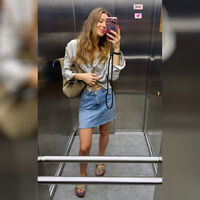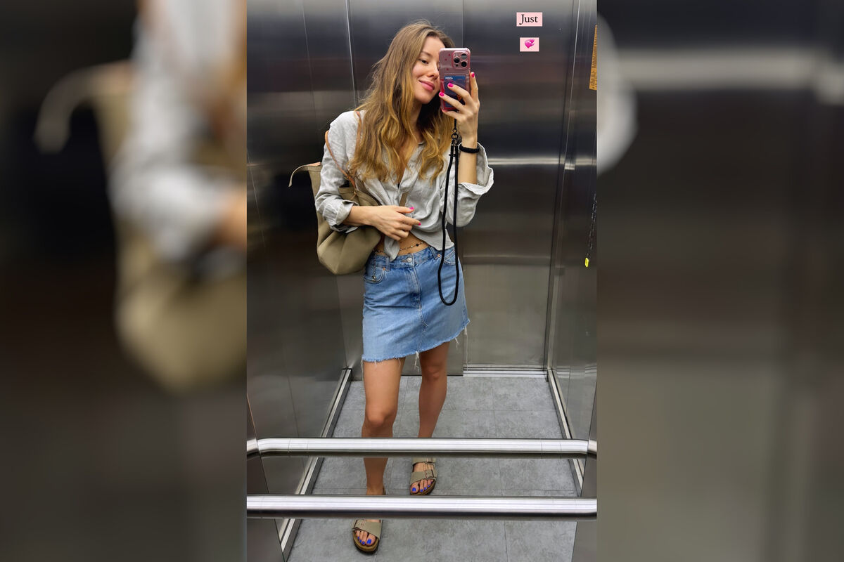 Ирина Старшенбаум решилась осветлить волосы и немного изменить форму прически. На фото она позировала в мини-юбке и рубашке. Образ дополнили сумка и замшевые босоножки.