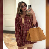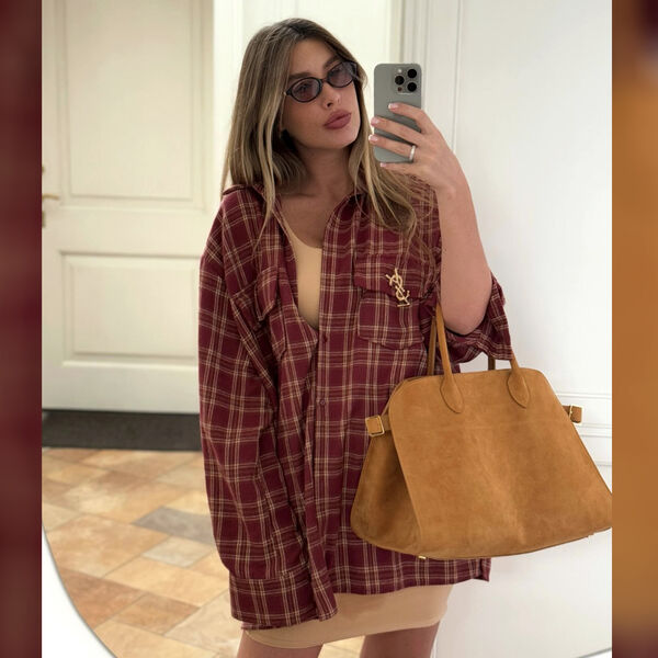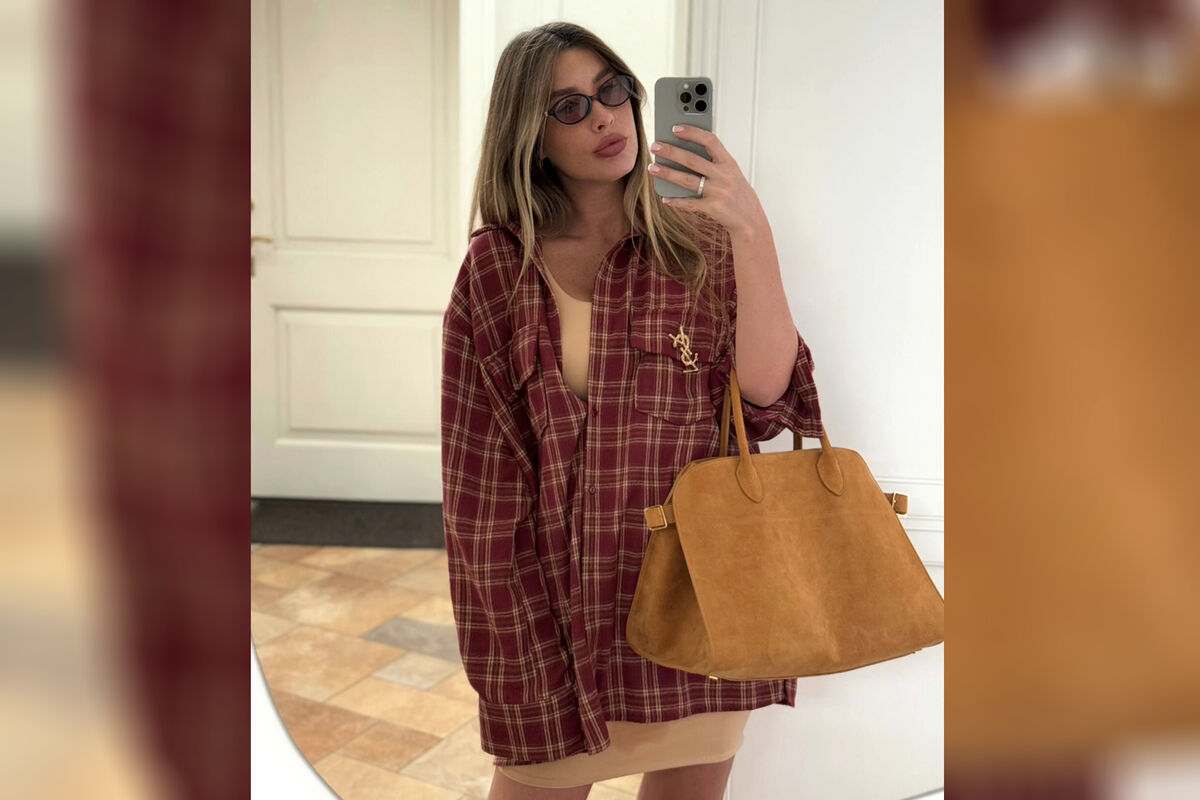Кети Топурия снялась в облегающем бежевом платье, которое дополнила рубашкой в клетку с брошью YSL. Образ дополнила замшевая сумка The Row и солнцезащитные очки. Волосы она распустила и сделала легкую укладку.