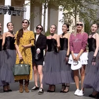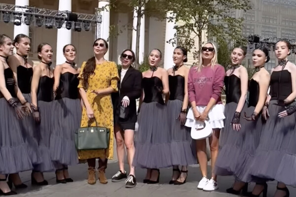 Настасья Самбурская в пестром платье станцевала с Натальей Рудовой и другими артистками на площади у театра. Образ она дополнила сумкой Birkin от бренда Hermes, стоимость которой составляет около 2 миллионов рублей.