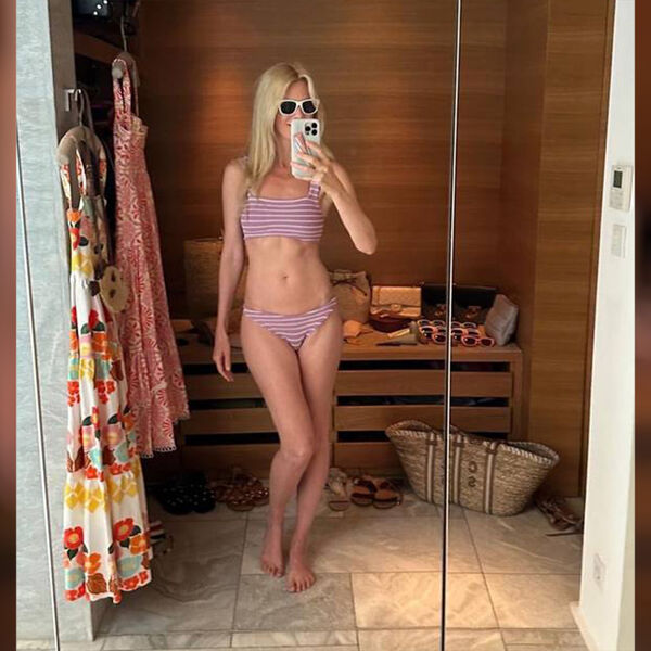 54-летняя Клаудия Шиффер позировала в полосатом купальнике перед зеркалом. Волосы она распустила и сделала легкий макияж. Образ дополнили солнцезащитные очки.