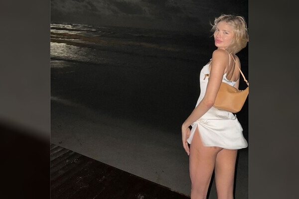 Модель Лена Перминова позировала в бельевом мини-платье без бюстгальтера. Образ дополнила коричневая сумка из кожи. Волосы она распустила и сделала легкий нюдовый макияж. Однако в кадре юбку поднял ветер и показал синяки на ягодицах модели.