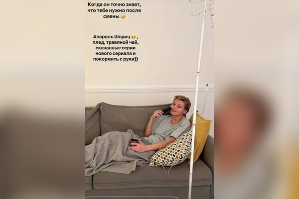 «Когда он точно знает, что тебе нужно после смены. Апероль Шприц, плед, травяной чай, скачанные серии нового сериала и покормить с руки», — подписала кадр артистка.